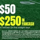 You must opt-in and wager $10+ cash on any market with odds of -500 or longer to receive $50 in FanCash each day for your first five days (issued when qualifying wager settles). Your five days begin the day you establish your account. See full Promo Terms and FanCash terms in the Fanatics Sportsbook app. Want to get started? Click here to starting earning FanCash:
